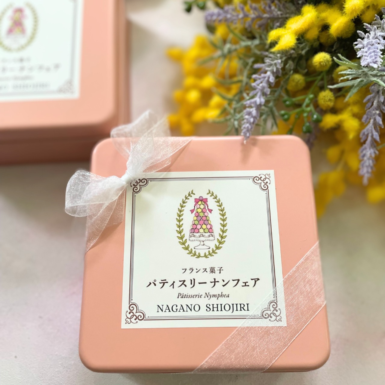 可愛いサイズのプチカヌレを、ピンクカラーの可愛い缶に詰めました。