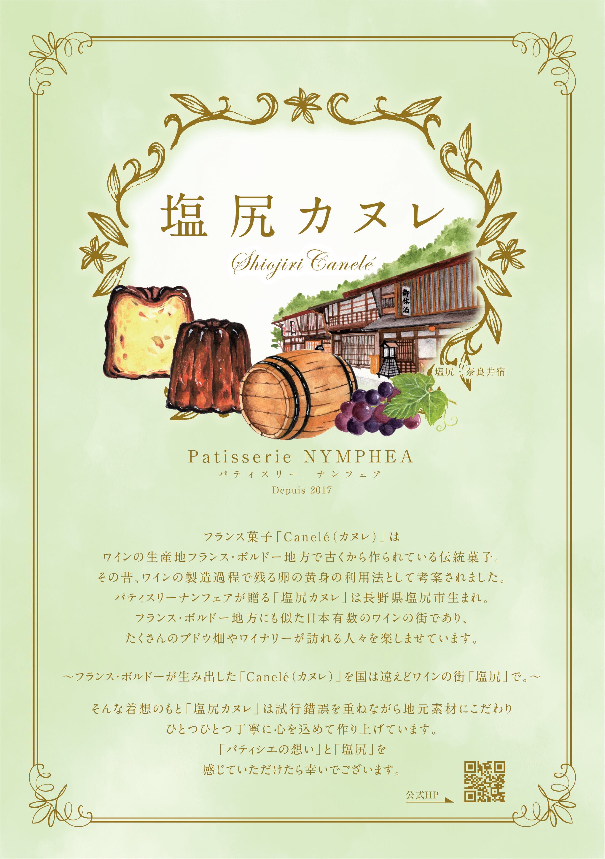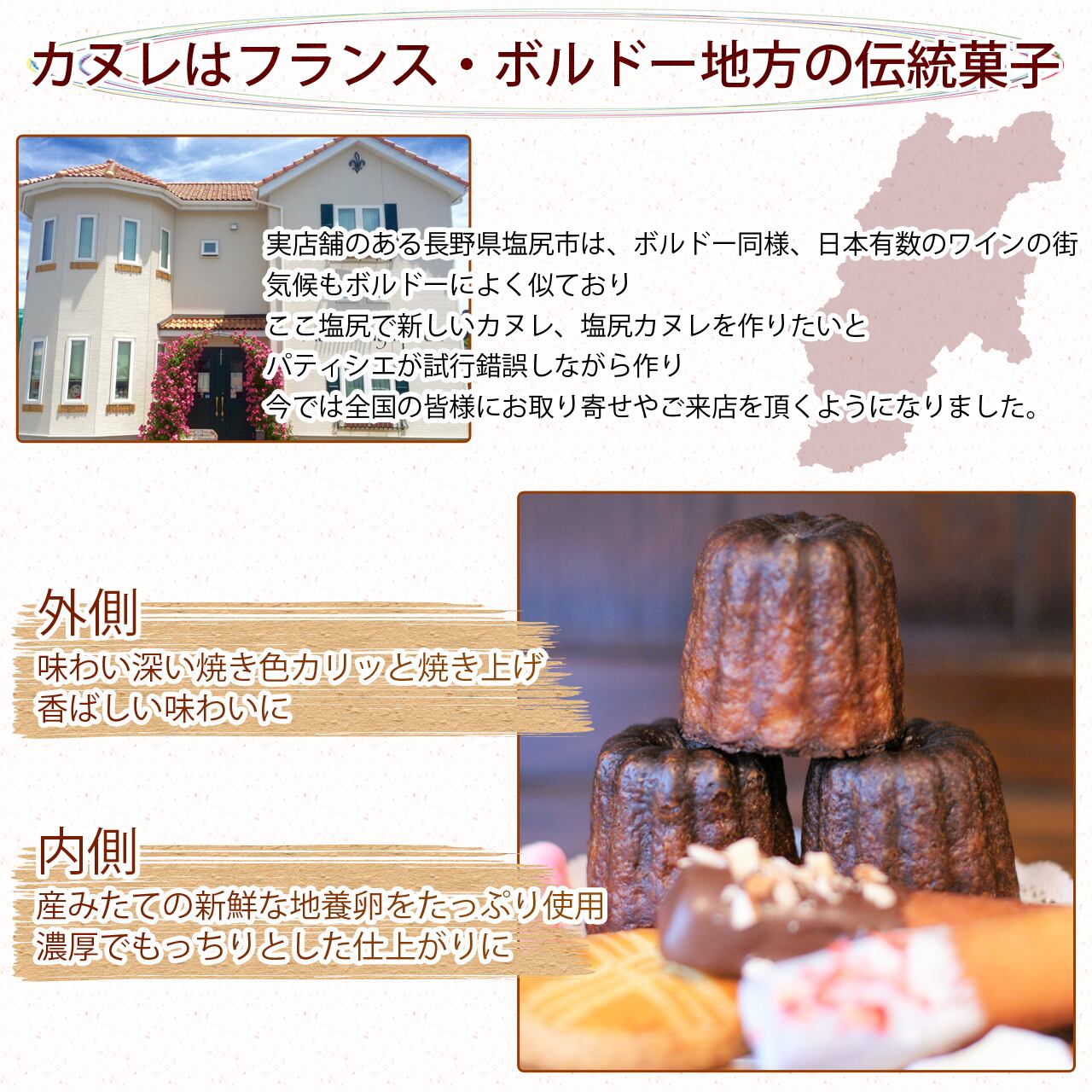 さて同じく日本有数のワインの街、長野県塩尻。国は違っても、ワイン醸造やものづくりに熱い情熱を持った人々が住む街。そんなワインの街、信州・塩尻で塩尻のカヌレ、新しいカヌレを作りたいと試行錯誤しながら作り上げてまいりました。パティシエの想いと塩尻を少しでも感じて頂ければ幸いです。地元長野の食材やこだわりの材料で作る塩尻カヌレは、いまや全国の皆様からご注文を頂き、実店舗では生産が追いつかずお早いお時間で完売してしまう大変人気の商品です。ぜひ一度ご賞味下さいませ。
